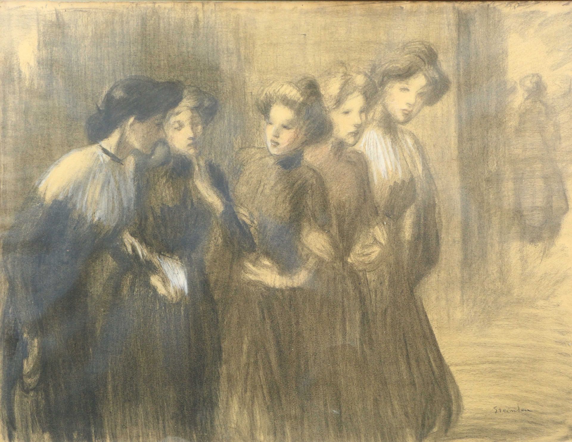 Des mots encore...chuchotés ceux-là... dans ce dessin de la fin du XIXème-début XXème : des femmes en cheveux à la taille de guêpe, murmurent, altières dans leur haut col. Cette conversation silencieuse révélée par le délicat trait de Théophile Alexandre Steinlen au fusain et à la craie fut adjugée pour 3100 euros frais compris.